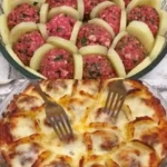 Step 6: Into the prepared baking dish, add the pasta and top with meatballs. Over the pasta and meatballs, evenly pour the sauce and sprinkle with cheese.